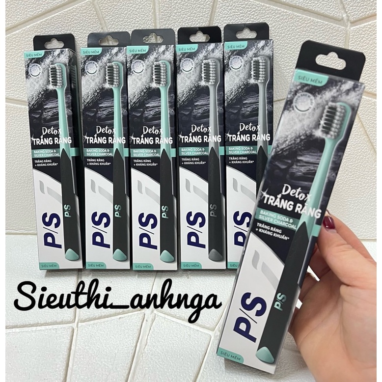 Bàn chải đánh răng P/S Detox Trắng Răng với lông chải phủ baking soda & charcoal giúp trắng răng, sạch khuẩn.