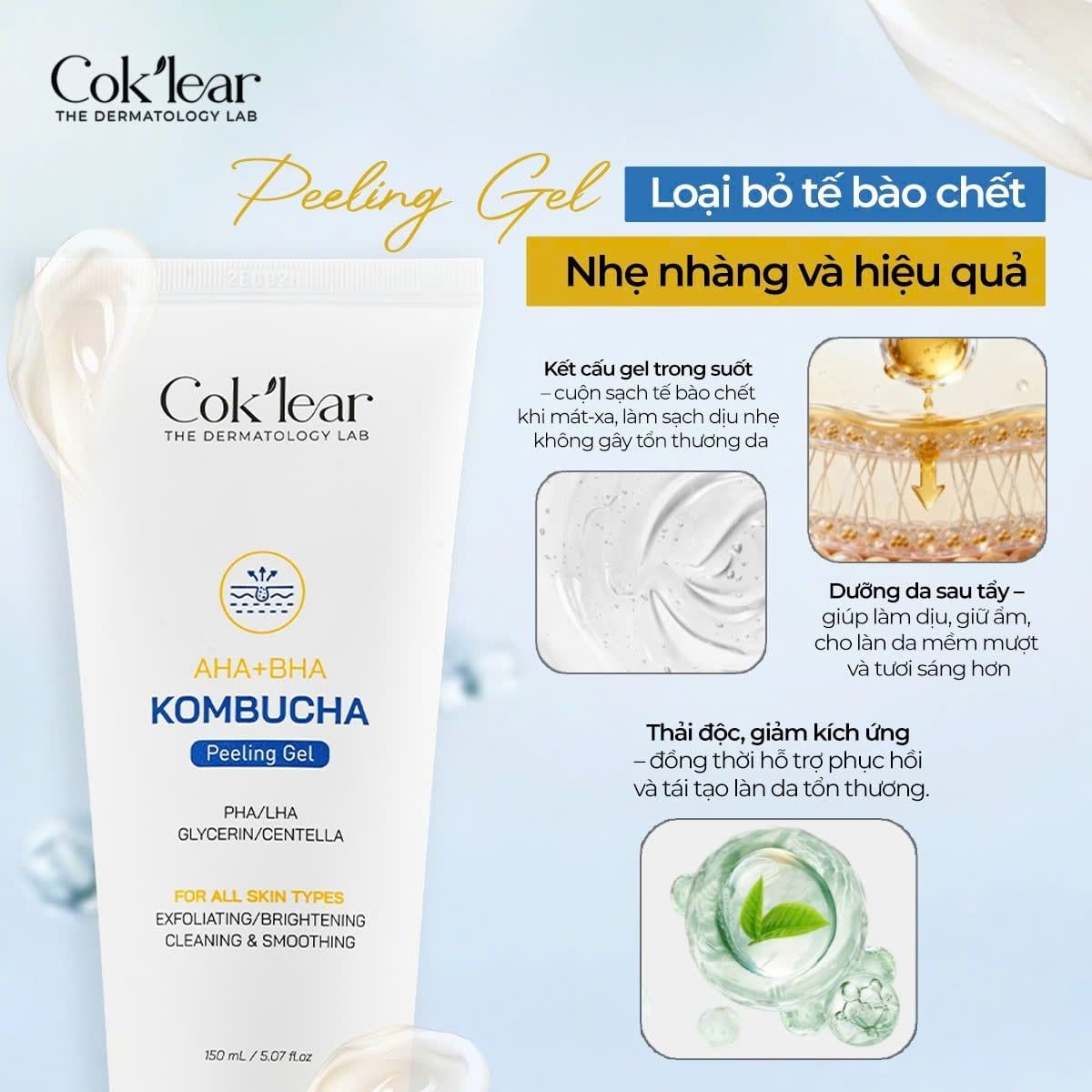 Sức mạnh của tẩy da chết Cok’lear Kombucha nằm ở sự giao thoa giữa cơ chế vật lý và hóa học, giúp tối ưu hóa hiệu quả làm sạch: