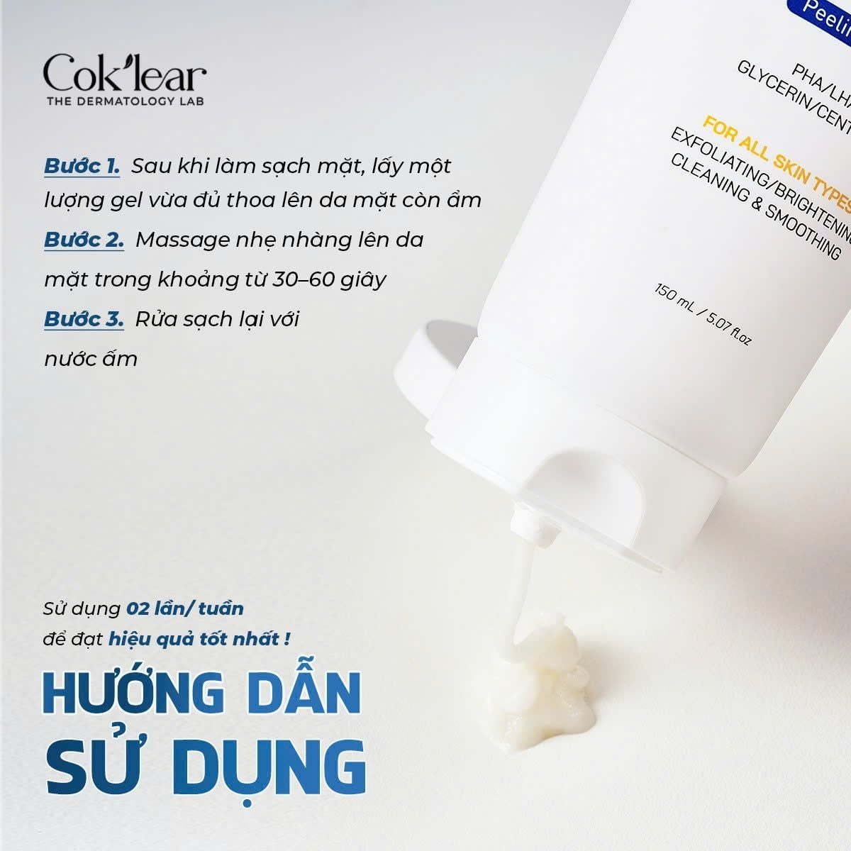 - Thoa gel: Lấy một lượng gel tẩy da chết Cok’lear Kombucha vừa đủ, thoa đều lên da (tránh vùng mắt và môi).